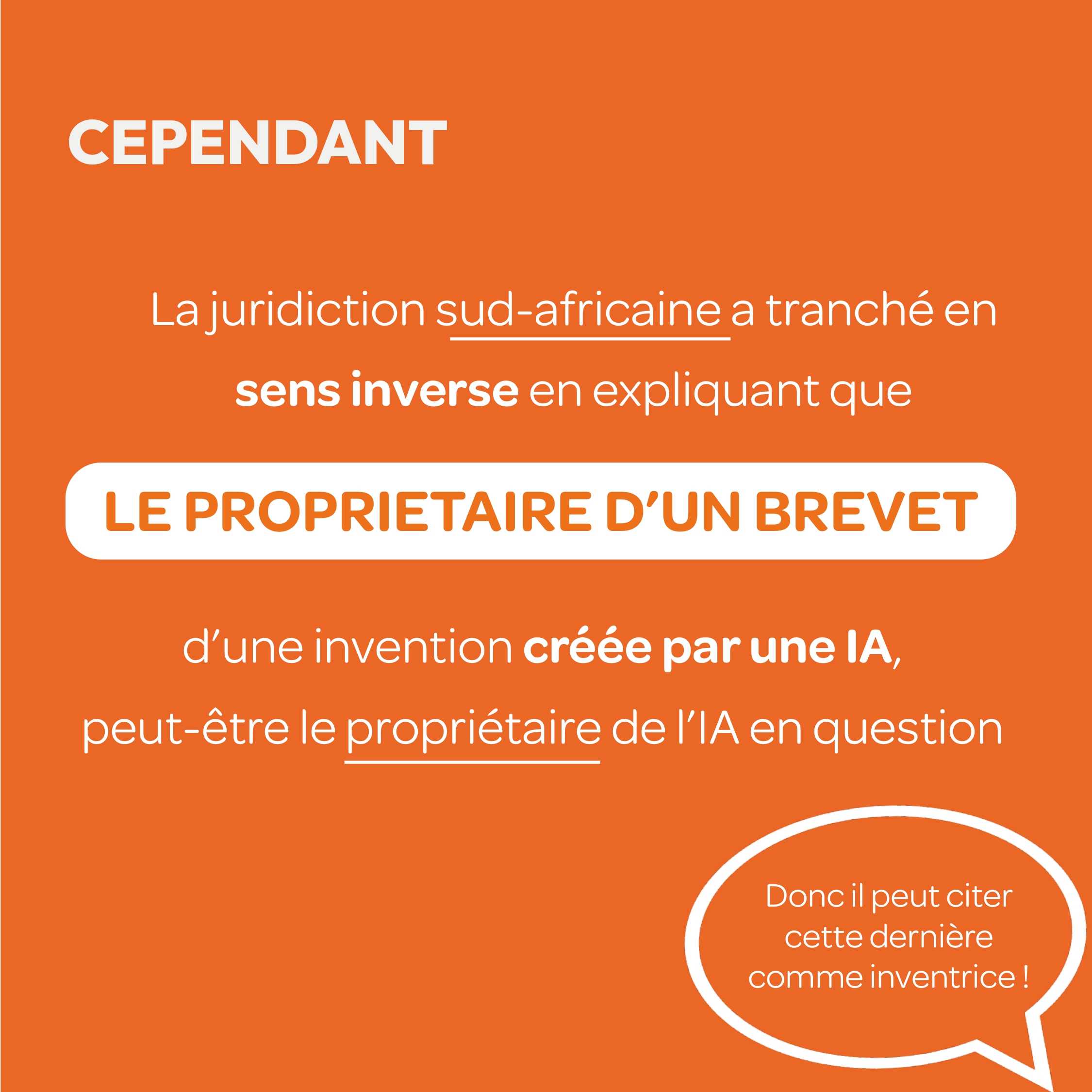 - JL : La juridiction sud-africaine a elle tranché en sens inverse, en considérant que le propriétaire d’un brevet pour une invention créée par une Intelligence artificielle peut être le propriétaire de l’intelligence artificielle en question et qu’il est alors autorisé de citer cette dernière comme inventeur.