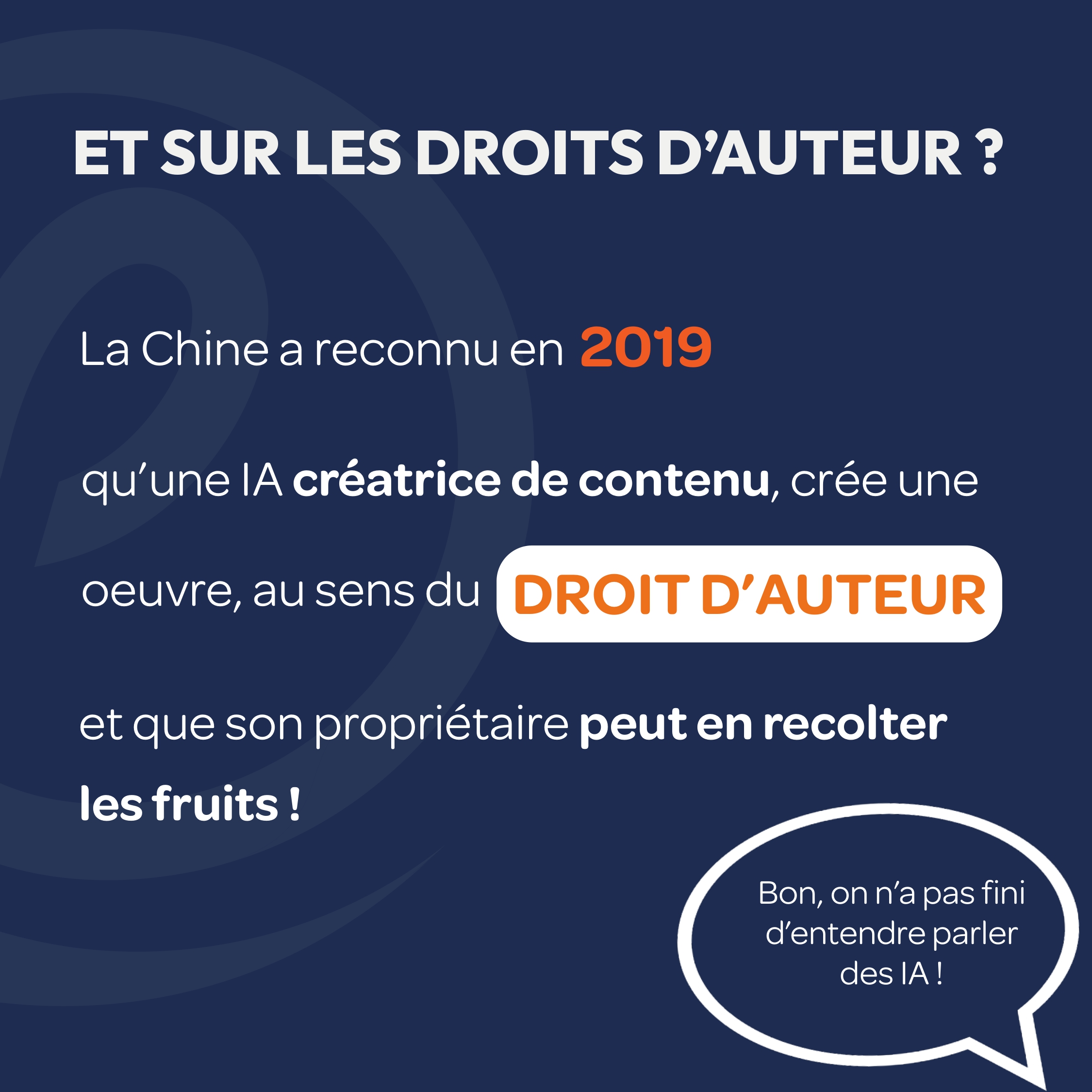 - JL : sur le terrain des Droits d’auteur, la Chine a reconnu en 2019 qu’une IA créatrice de contenus créé une œuvre au sens du Droit d’auteur et que son « propriétaire » peut en récolter les fruits, juste en la laissant travailler